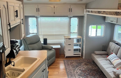 Experience glamping at our newly renovated camper on Lake Hartwell. This cozy retreat accommodates up to 5 guests, with a queen bed, a fold out futon and a queen air mattress (located in the porch storage bin). Enjoy a range of amenities including a screened in porch, bath house, laundry facility, pool, lounge, tennis and basketball courts, and scenic nature trails. A short ten minute drive provides access to the dock area, life jackets and basic fishing gear provided. Note: boat storage is not available at the RV nor dock area. Please consider storage/docking options if you plan to bring your boat.