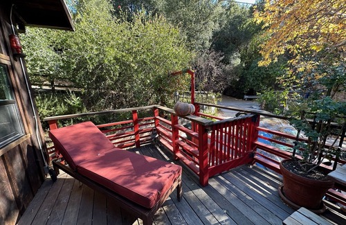2BD/2BATH —This elegant, rustic home, nestled among heritage sycamores and oak trees, sits on a seasonally flowing creek. Gorgeous natural light fills the cottage with skylights in every room. Stunning foliage views out each window. The living room and dinning room/office have tall, vaulted ceilings. There is a full kitchen with all stainless steel appliances including a dishwasher. 2 cozy bedrooms with 2 large bathrooms, one with a beautiful hand hammered copper bathtub. The back bedroom also has a loveseat with a pullout double sized bed. 4K TV in back bedroom with HBO Max, Disney+, Netflix, Hulu. There is a large bright living room with a full wall of picture windows looking out at the massive sycamore in front. The Living room has a cast iron wood stove and the room leads into a large tv room/office with a wall of 11 foot tall picture windows. TV room has a 4K TV with HBO Max, Disney+, Netflix, Hulu. The house is only steps from miles and miles of Topanga State Park hiking trails. The home has Zero VOC paint, Zero VOC stain on the butcher block counters, bamboo floors, Spanish tile and slate throughout and a tankless water heater. The house is 1200 square feet with a large front deck and private fenced in back yard. Washer and Dryer on the premises. This is the quintessential Topanga home in the heart of a truly special community.