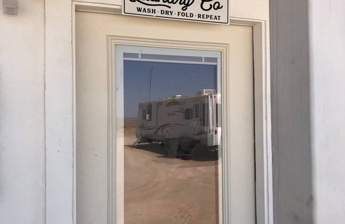 There is a laundry room available in the back it takes $3.75 in quarters per load.