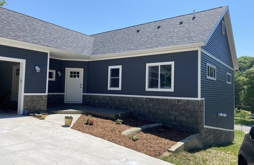 New build finished in 2020. Open front deck, lower level walkout basement with patio area, lots of beds (and extra single mattresses in basement storage) to comfortably sleep 12 to 14. Two living areas to spread out if need be. Nice wooded walk to lovely downtown Frankfort, shops and dining, is just under one mile. A close walk and access to Lake Michigan and Frankfort beach! Short drive to nearby beautiful Crystal Lake.