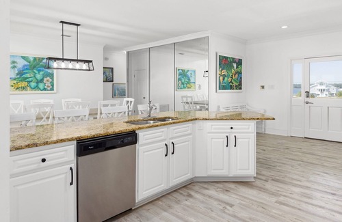 Upon entry to Mimi's Hideout, guests are greeted by an open-concept kitchen and living room overlooking an expansive gulf-front deck. To the left, you will find the laundry room as well as two bedrooms connected by a Jack and Jill bathroom. To the right, you will find the main bedroom with a gulf-front king bed and en suite bathroom, as well as two more bedrooms and another bathroom in the hallway. Beyond the family-friendly floor plan, this Gulf Shores vacation home offers an electric fireplace, comfortable indoor and outdoor seating for every guest, plus TVs in the main living area and every bedroom.