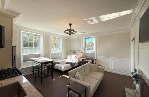 THE HALE LOFT - A newly-renovated suite in Liberty Emery House located in the heart of downtown Exeter and next to Phillips Exeter Academy (PEA). Its granite/stone kitchen features gas stove, refrigerator with ice maker, and island table for 6. Its private bath features all-in-one washer & dryer, toilet with Toto bidet, and a soaking bathtub with shower gadgets. The Hale Loft boasts four 80"H windows and the original 1750’s wide pine floorings and fireplace. 50” Frame TV in unit. Reserve today!