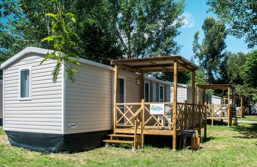 "Happy Easy", 3-room mobile home 25 m2. Object suitable for 4 adults + 1 child. Practical furnishings: living/sleeping room with 1 sleeping facility, dining table, electric heating and air conditioning. 1 room with 1 french bed (140 cm, length 190 cm). 1 room with 2 beds (70 cm, length 190 cm), 1 x 1 bunk beds (65 cm, length 179 cm). Open kitchen (4 hot plates). Shower/WC. Air-conditioning (extra). Terrace partly roofed. Terrace furniture, electric barbecue (portable), deck chairs (2). Facilities: mosquito net. Parking (1 car). Please note: non-smokers only. Maximum 1 small pet/ dog allowed. IT029040B14KOQCKTE