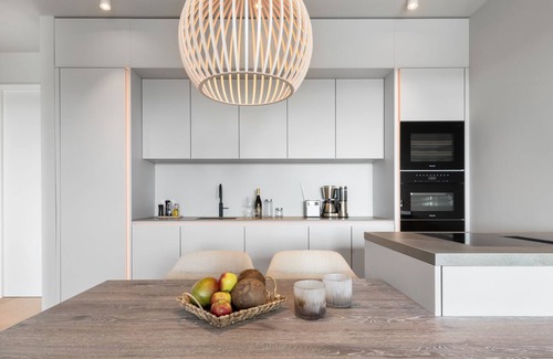 The heart of the apartment is the open living area, which is bright and inviting. The modern SieMatic kitchen is fully equipped with an induction cooktop, oven, warming drawer, and dishwasher. You’ll also find a Quooker in the kitchen, allowing you to easily create hot and sparkling water. For cozy evenings, there is a comfortable seating area where you can spend time together or enjoy a movie on the smart TV.