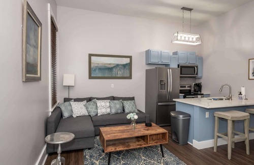Each stylish apartment includes modern appliances, furnishings, and décor, tied together by the calming color scheme and eye-catching signature blue cabinetry in the kitchen. Open concept living spaces are welcome places for entertaining, each just a little bit unique from the others. Everyone will find a spot that speaks most to them, from the floor-to-ceiling windows with ample natural lighting in apartment #1 to the arched windows, urban views, and exposed brick of apartment #4.