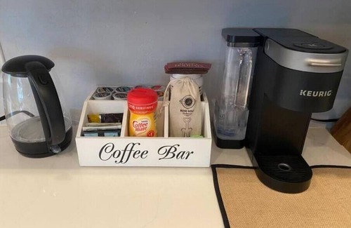 The Kitchen is fully stocked with all cooking essentials. A coffee bar is included with a Keurig machine and pods as well as a variety of teas. The kitchen is open to a full size dining table for a traditional meal, and an additional three guests can sit at the breakfast bar.