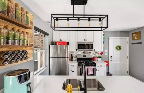 Modern apartment new in 2020 with easy access to 18th Street restaurants, Fulton Market & Downtown via Pink L train (0.5 mile). Comfy KING BED, pullout sofa, laundry in-unit, FULLY STOCKED kitchen, private outdoor patio, grill & firepit! Heart of Chicago is a quiet, incredibly well-preserved area at the edge of Chicago’s hip Pilsen neighborhood, brimming with original 1880s vintage character & unique architectural charm, + the best Italian & Mexican food in Chicago!