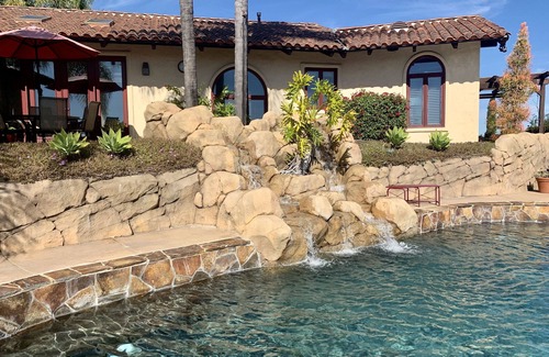 The Hilltop Hacienda is a unique home where you and your family can relax in the saltwater pool, soak in the Jacuzzi while gazing at the stars shining over Palomar Mountain, and dine al fresco while taking in stunning 360° views. Whether you are looking for a romantic couple’s getaway or a sun-soaked vacation in a spacious and comfortable home, this 3,980 SF villa on seven acres, can be your private oasis. The Hilltop Hacienda is located in a small gated community on the outskirts of Escondido. We the owners, are hobby winemakers and our vineyard has 180 Viognier and Syrah vines planted on the slopes leading up to the residence.