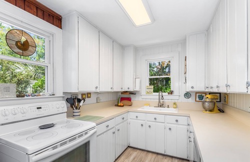 Upstairs: The upstairs living space is around 1500 square feet. It is small but has a cozy and "open" feel. 4 bedrooms about 10'x12' ea, (bed sizes king, queen, 2 twins, 1 full), two full-sized baths, one with a shower, one with the original mint green tub and fantastic original tile. Living space with comfortable furnishings, eat-in areas include dining area for 6 and bar area for 4. Kitchen fully equipped with cookware, dishes and silverware, fridge, microwave, dishwasher, drip and Keurig coffee makers, tea kettle, as well a s other small appliances.