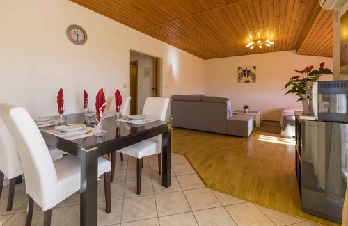 The holiday apartment is located in an apartment house and is furnished in a modern style. Also due to the view over the sea from the property the domicile is popular. Available for your exclusive use: parasol, barbecue facilities and garden furniture.LocationPovile. The holiday apartement is located on a enclosed garden plot, bordered by a fence. The landlord lives permanently in the house. Access is via a side road. Parking is available on the property. Specialair conditioning.Facilities: internet access (WLAN). TV reception takes place via satellite. Dogsallowed, EUR 8.00/pet per day. DistancesShopping 500 m, restaurant 2,5 km, town center 2,5 km. Rijeka: airport 30 km and railway station 45 km. In summer: Bathing possibility 166,9 km in Povile (beach 166,9 km in Povile featuring gravel). DivisionHoliday apartment, 1 floor, 3 rooms (including 2 bedrooms), 85 sqm, in total 5 beds (including 2 additional beds). RoomThe entrance to your holiday apartment is located on the ground floor. Living room with 2 additional beds on couch/sofa, sitting area, TV and access to the balcony (garden furniture, parasol). Bedroom with 1 single bed. Bedroom with 1 double bed. Kitchenette in the living & bedroom with electric stove (4 plates), oven, fridge (icebox), toaster and electric kettle. Bathroom with shower, 1 washbasin and WC. Terms of lease and pricesIncluded in the priceinternet access, parking place, electricity, gas, water, final cleaning, bed linen, hand towels. Side costs-Additionally(Payable when booking)/registration fee obligatory 5 € per person per stay. additonal fee for short-term stays (less than 3 nights) obligatory 30% per booking per stay.Costs on the spot:/Obligatory:air conditioning 7 € per object per day.Deposit:EUR 100,-/object