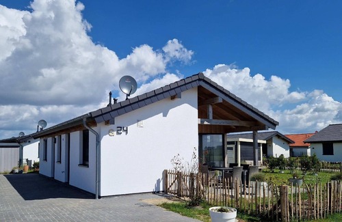 Newly built house G 24, SAUNA with outdoor shower (ATTENTION SAUNA in the outdoor area in your own garden), fenced, first occupancy 2022, no pets allowed, electric shutters in the 2 bedrooms, 1 bathroom + 1 guest toilet, fly screens on all windows, fully tiled, washing machineNewly built holiday home with 66 sqm living space for 5 people with 2 bedrooms, 2 double beds and 1 bathroom + 1 guest toilet- Own 429 sqm plot- 2 bedrooms (1x double bed, 1 double bed + 1 bunk bed)1 bathroom with wall-mounted towel radiator- 1 spacious living room with large floor-to-ceiling windows- Fully equipped fitted kitchen with dishwasher and microwave- 1 storage room / 1 hallway- Covered sun terrace with garden furniture, parasol, garden loungers, barbecue- Outside water tap- 2 car parking spaces.