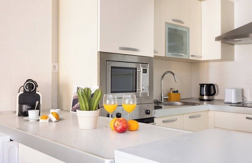 Beautiful flat with terrace and communal pool in Palm-Mar, Arona. A few minutes from the sea, located in an exclusive residential complex, with a beautiful swimming pool and paddle tennis court. Equipped, with a beautiful decoration in which every detail has been taken care of, capacity for 3 people and a nice terrace where you can have breakfast. In the south of the island,where you can breathe tranquillity and a summer atmosphere all year round, it's the perfect place to spend a great holiday.It is ideal for couples, families and business trips, as it has Wifi Fiber Internet, designed for teleworking. It has capacity for 3 people, a bedroom with a queen size bed and access to the pleasant terrace overlooking the pool where you can have lunch and relax. With an open plan kitchen fully equipped with all appliances, integrated in the spacious living-dining room with sofa-bed and access to the terrace. It also has a bathroom, lift and Smart TV. All this within an exclusive residential complex with swimming pool, rest areas and paddle tennis courts. Very well located, in the south of the island, but at the same time in a very quiet area, a few minutes from the sea, with restaurants, cafes, supermarkets and leisure areas around.It has a fully equipped kitchen, terrace where you can relax or have breakfast, fridge, microwave, oven, dishwasher, kettle, Nespresso coffee machine, hairdryer, fan, Wifi Internet, Smart TV, bed linen and shower towels, cot and high chair, communal swimming pool and paddle tennis courts.