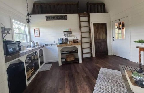 Farmhouse decor , covered porch with rocking chairs, extra open loft bedroom , outside fire pit, bbq grill, fenced backyard and plenty of outdoor space to explore. We are close to town for all your needs but far enough out to feel away from it all. It is fenced and set apart from the other tiny home on the property.
