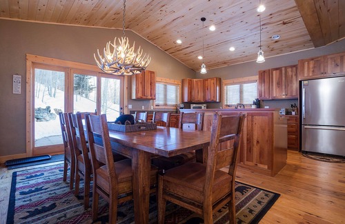 4 BD / 3BA that boasts polished wood floors throughout, lots of natural light, modern finishes mixed with some mountain elements and inviting living spaces. This home offers great flexibility, a nice option for a group as it has a lot of beds, or two families traveling together, and you're also welcome to bring the family dogs!