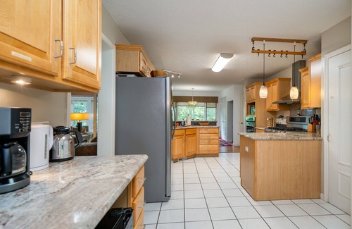 The house is situated on a steep hill, surrounded by 3.5 acres of forest, out of sight from neighbors. The road to the house and the driveway are NOT steep. But with the hillside falling off quickly below the house, so there is not a lot of yard. The huge deck seems to float among the tree tops, offering shade when you want it, but magical views of far-off mountains. It will be easy to forget that you are less than a mile from Starbucks, fine dining, groceries, breweries and other conveniences.