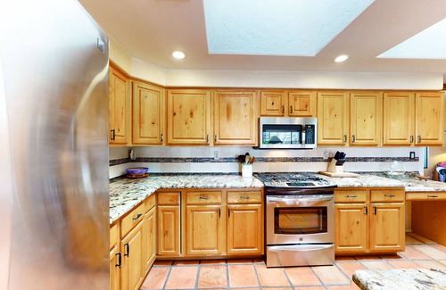 Return back to your humble home away from home after a splendid day out and relish the interior decor of this astounding vacation rental. Kick up your feet in the spacious living area and enjoy bathing in the natural sunlight that pours from the windows. Step into the full kitchen and whip up something delectable for you and your guests and sit down at the bar area and feast to your heart's content. This home is absolutely oozing with Arizona aesthetic, from the knickknacks placed all throughout the home to the paintings that hang on the walls.