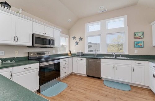Inside It's A Wonderful Life, you'll also have access to a ground-level rec room; complete with a pool table, daybed, flat-screen TV, and wet bar. The perfect space to get out of the sun for a little while and have fun with family and friends. Upstairs, you'll be greeted by an open living area with ample seating, a flat-screen TV, and a fireplace for you and your crew to relax, unwind, and spend quality time together. Need to prepare meals during your stay? No problem. The kitchen at this OBX rental home is spacious and features stainless steel appliances that make cooking a breeze. The breakfast bar seats 4 and the dining room table seats an additional 10 so everyone can dine together. You'll also have the option to dine outside on the furnished sundeck while taking in the salty sea air. Each bedroom provides you and your crew with a comfortable place to rest up for the next day and the King Master suite even features a jetted tub for ultimate relaxation. Additional amenities at It's A Wonderful Life include an outdoor shower, ocean views, and a Keurig Coffee Maker.