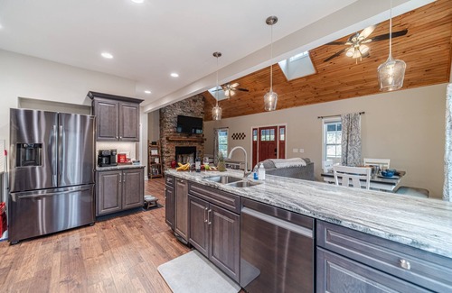 This BRAND NEW construction has all the bells and whistles in the modern kitchen fit for a chef! From our induction stove with pot filler to the touch-screen smart microwave and oven, the kitchen has all you need to cook up a fantastic meal for your family and has that open feel for entertaining everyone while your doing it! A large family dining table that expands to seat 10 is exactly what you are looking for when booking your family holidays. Comfortable furnishings throughout the main floor and large stone hearth give you a warm cozy feel while watching TV or catching up on game night with everyone. Right on the main floor you have a 3/4 wrap porch that has a gas grill for cookouts and outdoor dining for those nice warm days to enjoy the beautiful outdoors! Rocking chairs and a gliding bench on the front covered porch are great spots to cozy up and read or relax when its raining.