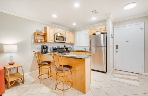 When you enter this remodeled 1/1 condo, the riverfront views will take your breath away! The sprawling oceanfront living room holds a comfortable sleeper sofa, a recliner chair, and television. The remodeled kitchen comes fully stocked for all your cooking needs and includes 2 bar stools.