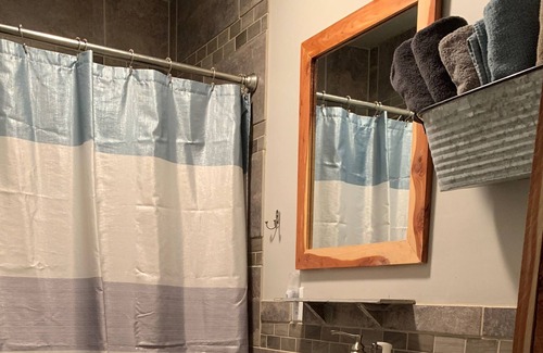 This room is one furnished bedroom, one bathroom. There are also beds upstairs in the loft, perfect for kids! A living room with a hide away bed, and a full kitchen. The porch overlooks the ranch so you can enjoy the scenery and sounds with your morning coffee.