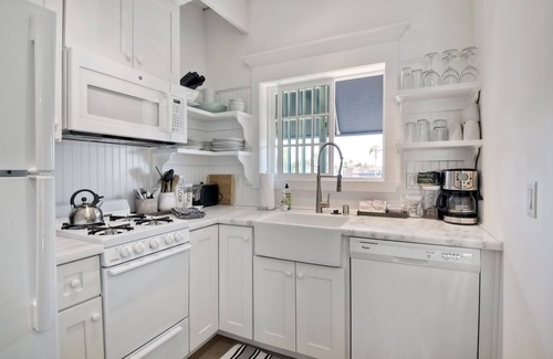 - Pristine all white color palette with gorgeous countertops and open shelving for easy to access kitchenware.