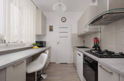 This spacious apartment at Kameralna 3 is the perfect place for families or groups of up to five people who value comfort and a quiet location with quick access to Warsaw city center. The bright, functional interior encourages relaxation, while the living room with a kitchenette and Smart TV creates a cozy space for spending time together. The fully equipped kitchen allows for preparing home-cooked meals, and two bedrooms provide comfort and privacy.