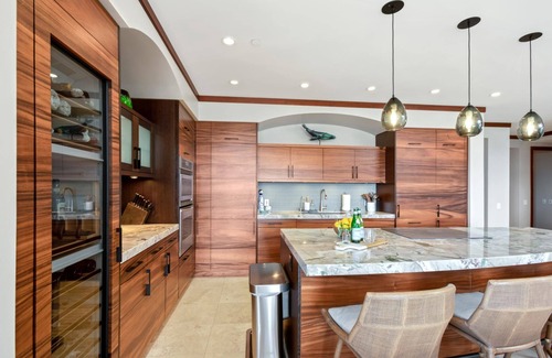 Wailea Beach Villas 412 represents the epitome of luxury and Hawaiian charm. This penthouse unit is a stunning example of modern aesthetics fused with traditional Hawaiian style. The kitchen features custom monkeypod cabinets and elegant countertops, creating a striking culinary space. With three spacious bedrooms and three bathrooms, the villa offers ample space for families or groups, providing the perfect combination of comfort and style.
