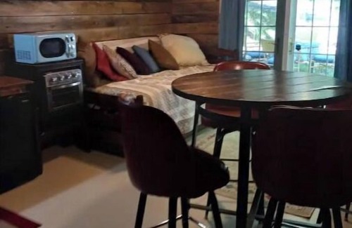 Weused unfinished lumber for the walls in the main living area. French doors, sinks, lighting and other little things came from habitat restore. The kitchenette is perfect size! The small oven is air fryer, toaster, bakes, and broils. Big enough for a pizza. There is a dining area inside but also 1 right outside French doors. There is another rental in the front. It is listed on here also. Plus you can rent them together (sleeps 10)There are some shared outdoor spots.encluding , and see some setting areas, no worries there are plenty of places to get privacy. is in the front it sleeps 2-4 The Bear Den (back) sleeps 6 is only a stone path to the back of the house. They are both listed separately on VRBO as well. Front has king size bed,full kitchen, full bath, living room, dining room, huge front porch with view. Back(townhouse) has 2 queens 2 twins, kitchenette, bathroom, small dining area. both have gas fireplaces, top of townhouse has electric fireplace.