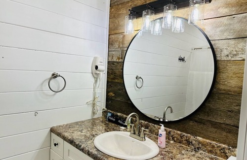 The KingCabin is a large suite with plenty of room. Enjoy dinner together or relax and socialize in the large sitting room. A mini-fridge, microwave, coffee pot, dishes and utensils are provided for your convenience. The King bed is super comfortable with soft sheets and plush pillows. The spacious bathroom provides plenty of room for our guests to move around. A walk-in shower is easy to use.