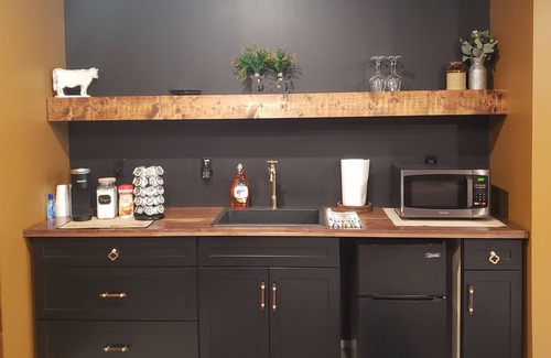 Country setting within city limits! Our brand new 2-story Barndominium accommodates up to 14 guests, 5-bedrooms (3 private rooms with King beds, and 2 rooms with 2 Queen beds in each), 4-full bathrooms (3 with stand-in showers and 1 with a tub). Full kitchen with individual kitchenettes, coffee stations in every room! Each room offers its own private full-bathroom. Enjoy the large double back deck great for entertaining or relaxing watching the wildlife, listen to the creek's waterfall, too!