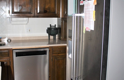 Large fully equipped kitchen with island bar, 25 lb ice machine, and nook table. Separate dining room will seat up to 10. Living room upstairs overlooks the lake.