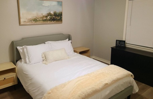 The home can accommodate up to 8 guests plus a baby with the 3 beds/bedrooms (1 King, 2 Queen), 1 Queen blowup mattress, and a crib.