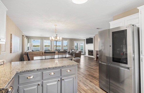 When you first walk into Frog Landing, you will be greeted with floor-to-ceiling windows giving you a perfect view of the water. Just off the house is a covered deck with seating and a charcoal grill. The boat dock stretches over the lake, providing an excellent spot for fishing and swimming. The updated and fully equipped kitchen has everything you will need for meals. In the bunkroom, you will find 3 bunk beds (sleeping 6), and there are king beds in each bedroom.