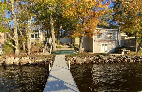 The house is equipped with a full kitchen with plates, pots and pans and basic cooking ingredients, a cozy living room with a fireplace, full tub/shower in the bathroom. In the living room, big picture windows overlooking the lake. Just outside the master bedroom, a spiral staircase brings you down to another room with a full/twin bunk bed and an additional queen bed. For another couple to enjoy privacy or social distancing, there is a separate bunk house with a bed and a sitting area that also overlooks the lake. The house sits feet from the shore. Enjoy the outside with a patio area, campfire, lakeside deck, or bench on the dock (removed in the late fall through early spring).