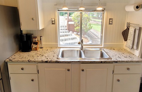 This adorable original cabin has a beautiful pine ceiling and a brand new remodel! Enjoy the beautiful quartz countertop in the well-stocked kitchen with pull-out faucet, full-size fridge, microwave, and more! The remodeled bathroom includes full shower with amenities, toilet, and sink. Snuggle up in the queen bed or pull out the full/queen sofa bed! Cabin is perfect for one or two people, but could (at most) squeeze two more small kids onto pull-out sofa bed. Note: they're all in same room. You will be comfortable year-round with the heat/AC mini-split temperature control and new double pane windows just installed. Memories will be made around the fire pit with plenty of included firewood to roast your marshmallows. As our guests, you will have access to our kayaks and paddleboards (already at our private dock from June through September, you do not have to carry to lake!).