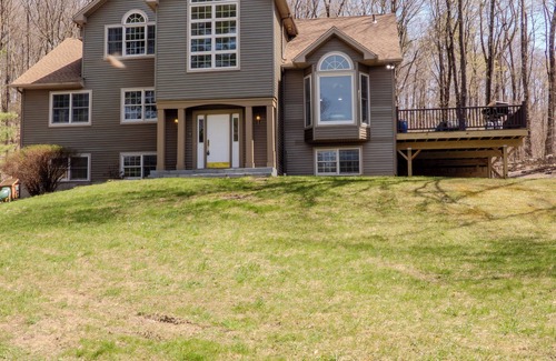 All bedrooms have air conditioning, pillow top mattresses, down pillows, down duvets, and luxurious soft linens. Upon entering the house the main floor is half a flight up and the first floor is half a flight down. The main floor has three bedrooms, bathroom, living room with air conditioning, dining room, kitchen. The first floor has another living room with sleeper sofa, bedroom, kitchen, and bathroom. The second floor of the home you will find the master bedroom with private bath and additional bedroom. There are beautiful nature views from every room and the large bay kitchen window overlooks the private front yard and spring fed pond. We have a game room with air hockey, magnetic darts, and table games. Pool table in the garage, and a playground in the back. The house is set on a hill, perfect environment for sledding in the winter.