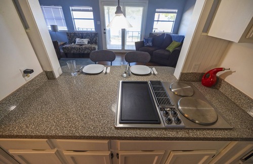 •Fully stocked kitchen with a full-size fridge, stovetop, oven, microwave, K-Cup coffee maker (with coffee and sweeteners provided), pots, pans, dishes, mugs, wine glasses, and more.