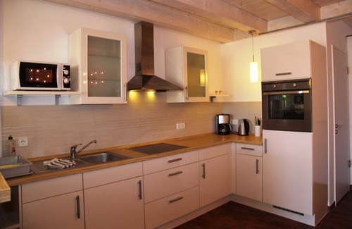 The modern and comfortable apartment with 77 sqm is located on the ground floor of Loft de Mar. The apartment has a spacious living room with a comfortable couch and TV, open kitchen joins the living room. The kitchenette has u on oven, microwave, refrigerator, freezer. V. M. On the ground floor there is a separate guest toilet. A large terrace with seating and views of the Peene is also located in Erdegschoss. The open gallery upstairs has an open bedroom with a double bed and a bathroom with shower and WC (both separate). In the apartment Wifi is available. The initial bed linen and towels can be ordered for a fee of 12 euros per person the Administrator (please specify when booking). Note: The upper floor is an open grid (see photo) complete, so we recommend renting the apartment only with adults. Improper behavior No liability is assumed by the owner.