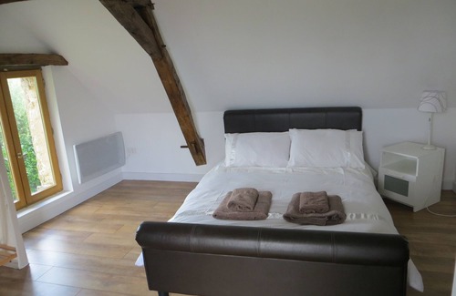 From the upper landing the master bedroom is located immediately in front of you. This master bedroom has windows on three sides (North, South and West) with a wonderful window seat in the bay of the south facing window. From here you can see the village of Meigne and its imposing church spire. There is a large ensuite bathroom which provides a full size bath and shower with a large old fashioned shower head together with a heated towel rail.