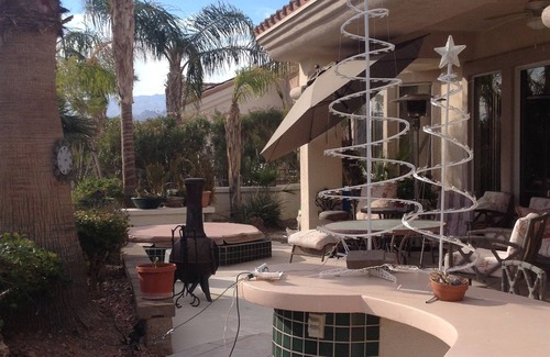Del Webb built home, 3Br with Ensuites, private office, fully accessorized kitchen,linens, BBQ, serviced Hot TUB, fenced pet friendly, citrus, overlooks golf course with Tees long way away,various species palm trees, golf cart,mail and post office service, room for visitors ,spacious Master Bath with privacy,ample parking, lovely patio furniture, patio server for entertaining, exquiste mountain views. Is winter home for owners. Owners effects are on site. Sun City is a world class famous resort. We seek world class occupants. ( We received one only "negative " review from no fixed address louts; please ignore as comments utterly false from known scammers).