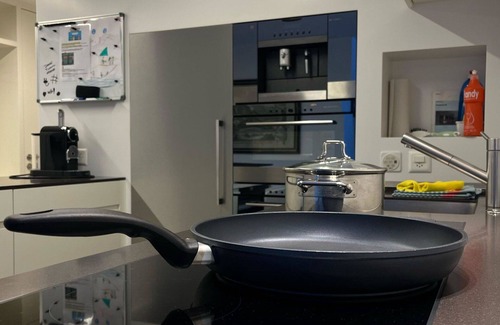The non-smoking flat, furnished with beautiful wooden elements, has among other things: 65-inch TV with Netflix, WLAN, Nespresso coffee machine, coffee bean machine, combi-steamer, hot-air oven, induction cooker, raclette and fondue set and much more.