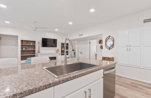 The open-concept and fully stocked gathering kitchen is complete with a fireplace, TV, huge granite island, coffee table, and plush captain's chairs. Enjoy coffee or tea with views of the fairway from the bistro table.