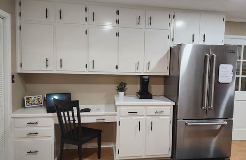 Our all-white kitchen is fully equipped with stainless steel appliances such as a dishwasher and refrigerator. We even have a microwave, an air fryer, and a Keurig coffee maker to make your stay even more comfortable. The kitchen is fully stocked with pots, pans, eating utensils, cups, plates, and cutting boards, so you can easily prepare your favorite meals during your stay. We also have a dedicated workspace and a laundry room with a washer and dryer.