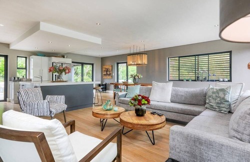 On main upper level beautifully fitted wine cellar, open plan lounge, dining area and sleek stylish kitchen with own scullery. Kitchen has large centre island with ceaserstone worktops and open to the main living spaces all with stack back doors to private patios. There are 4 bedrooms, main bedroom with fireplace, en-suite bathroom, built in cupboards and stack back doors to balcony with views. There are 3 further bedrooms (2 en-suite & 1 family bathroom). The upstairs level has 2 covered outdoor entertainment areas and a large balcony with panoramic views.