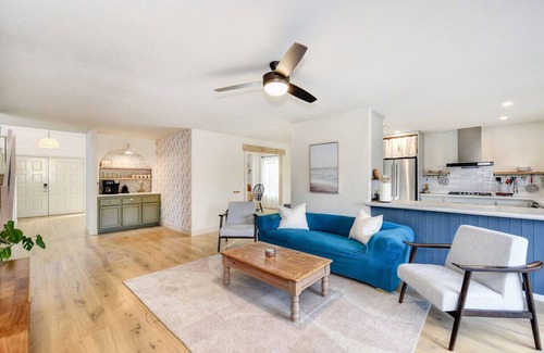 Find your zen in this serene 5 bedroom, 3 full bathroom home. Large windows let in tons of natural light, with plenty of space for your group to enjoy time together. Return home feeling rested after spending your nights in one of five unique bedrooms, fully equipped kitchen, wet-bar, and a private, landscaped backyard. Thoughtfully designed and furnished featuring ultra high-speed wifi, a dedicated office space, fully equipped kitchen, wet-bar, 2 large living rooms plus a fenced backyard. An abundance of natural light streams through large windows and vaulted ceilings. Located just off Highway 50, a short drive to Lake Tahoe and Sacramento.