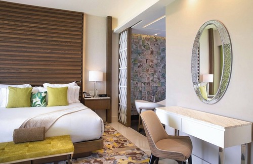 The master bedroom features a king size bed with a writing desk and flat screen TV with an ensuite bathroom accentuated with a jungle-effect panel complete with a rain shower, an exclusively designed bathtub, a state-of-the-art bidet toilet, and a his and hers vanity area.