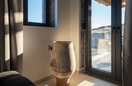 Villa R3 is a serene 70 sqm retreat designed for up to 3 guests, offering breathtaking sea and mountain views in a peaceful hillside setting just moments from Lentas village and beach. Inside, you'll find one spacious bedroom with a luxurious king-size bed, perfect for restful nights. The living room features a stylish sofa bed, flat-screen TV with Netflix, a cozy fireplace, and a welcoming ambiance that invites you to relax and unwind.