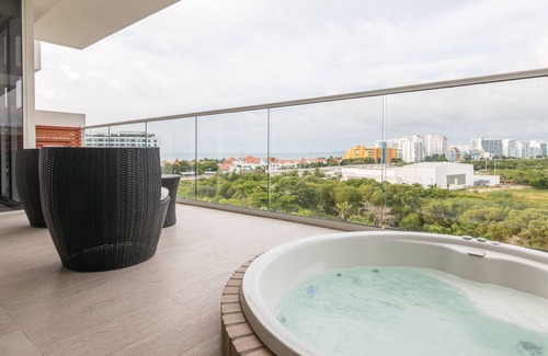 Modern one bedroom apartment w/ private jacuzzi and a panoramic view of the city and sea. It is fully furnished w/ all the comforts and amenities necessary for a pleasant stay;
