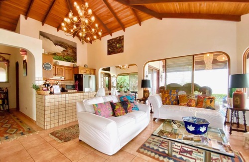 This private and gated villa is located in a safe, quiet, and peaceful neighborhood, surrounded by landscaped gardens and beautiful scenery. The villa features European-inspired decor and floor-to-ceiling windows. Experience a taste of Pura Vida.