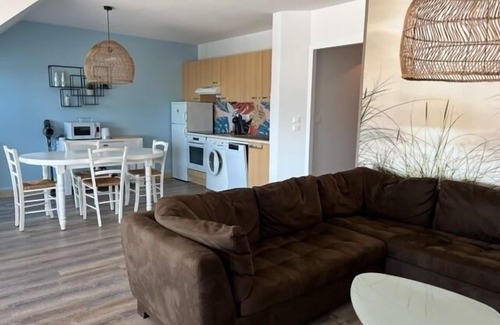 Bright living room, equipped kitchen (dishwasher, toaster, Dolce Gusto coffee maker, kettle...) and its dining area
